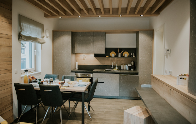 The modern kitchen offers all the necessities so you can enjoy a morning coffee or tea or cook a delicious meal after an exhausting day in the mountains for you and your company. This includes an induction stove, oven, a refrigerator with a freezer, a dishwasher, etc. The large wooden dining table creates a pleasant atmosphere during the cold winter days and is also perfect for playing board games with your family or friends.