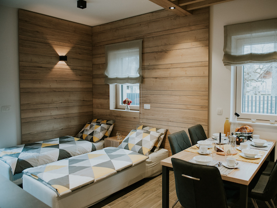 The apartment combines the Alpine wooden ambient with a modern elegant decor. It spreads over 40m2 and has a large atrium that spans two sides of the building and faces both east and west, spreading over 45m2 and offering a beautiful view of the mountains. Apartment Jasna can accommodate up to 5 people and features a joint living room and kitchen, a bedroom and a bathroom.